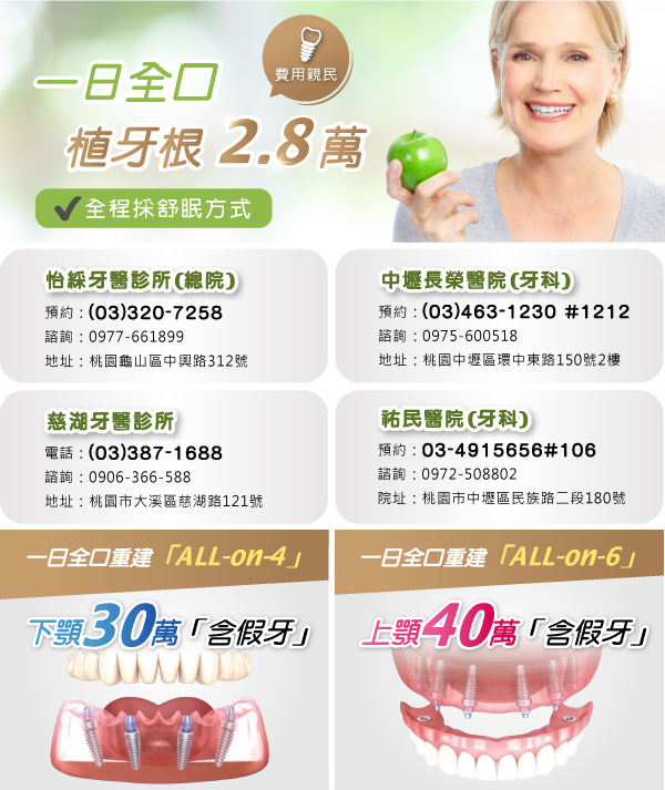 採取療程較短且價格更經濟的All-on-8全口速定植牙,手術完當天裝上固定假牙後,慢慢適應咬力,即可恢復正常飲食。進行植牙重建手術後,定期回診檢查也相當重要,維持良好的牙齒保健習慣,一口美麗的牙齒才能相伴終生。